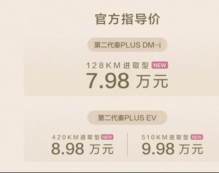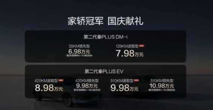 全球节能省油领域,比亚迪堪称标杆。国庆前,其连发秦PLUS DM-i 128KM进取型、秦PLUS EV 420KM/510KM进取型三款新车,“国庆献礼价”6.98万起,直接将合资燃油车逼至绝境。